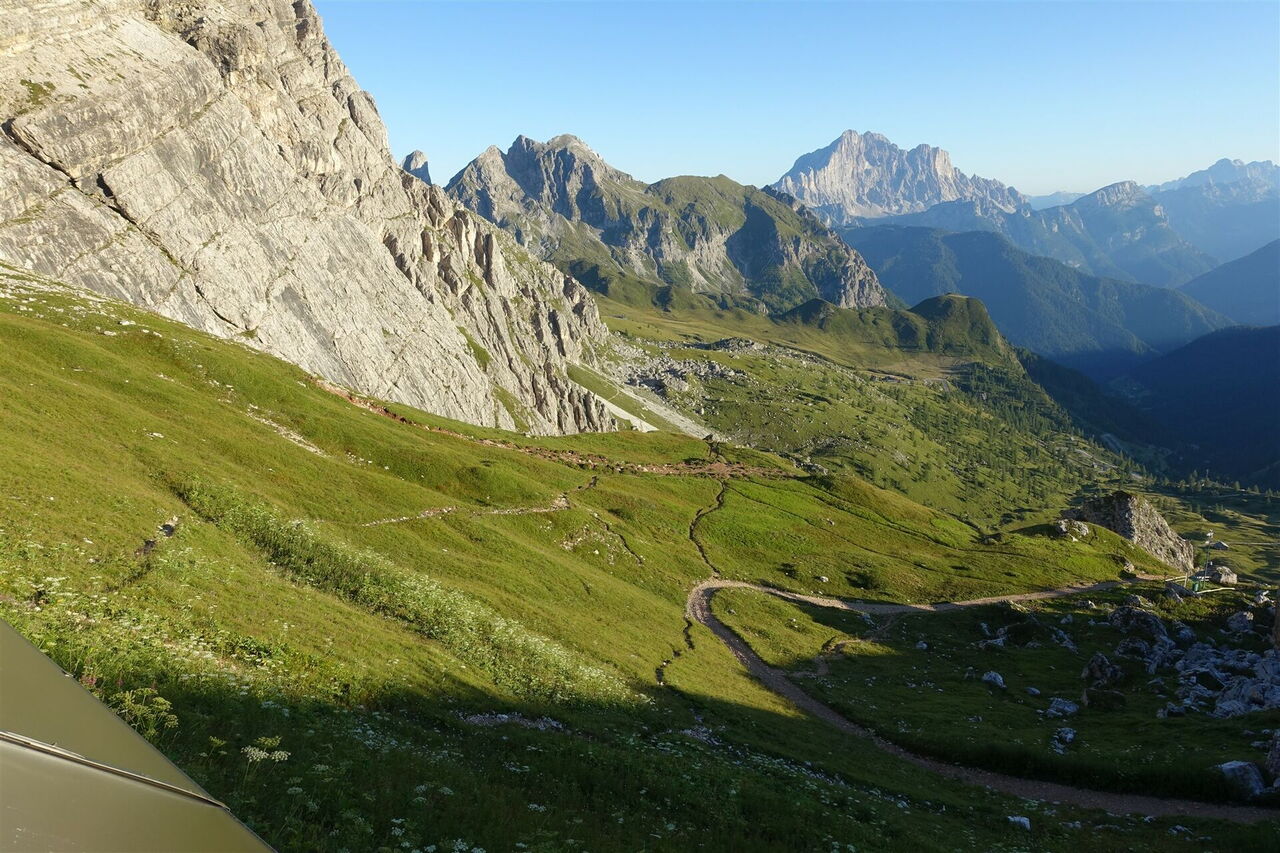 Reich an Varianten ist der weitere Weg. In diesem Wanderführer nicht weiter beschrieben ist der Abstieg vom Rifugio Nuvolau in östliche Richtung, über den leichten Klettersteig Via Ferrata Ra Gusela (man benötigt allerdings ein Klettersteigset!), bis zum Passo Giau (Wanderwege 438, 444 und 452, Strecke 3,4 km, Abstieg 370 m). Mit der hier beschriebenen Variante 1.4 und der im nächsten Kapitel beschriebenen Variante 1.5 spart man sich im Vergleich zu den Touren 8, 9 und 10 gerade einmal 30 Minuten Wanderzeit, 2 km Strecke sowie 310 Höhenmeter bergauf und bergab. Geht man diese beiden Varianten, so verpasst man aber den zauberhaften Lago di Federa, einen der schönsten Bergseen in den Dolomiten.