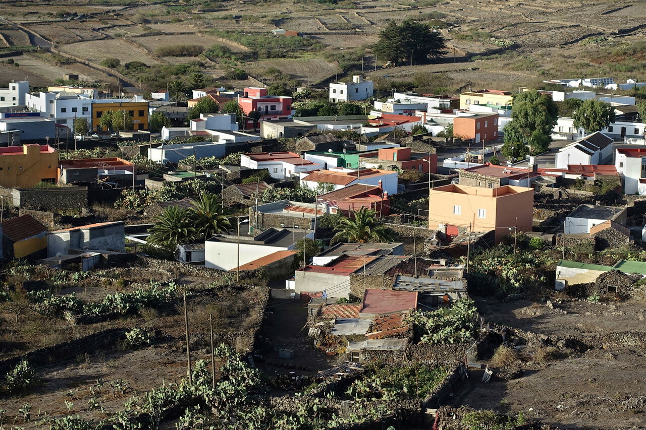 Nachdem wir gut 180° auf dem Kraterrand gelaufen sind, steigen wir bei einer Einbruchstelle des Kraterrands zur tiefer liegenden Piste ab. Es ist kein einfaches Unterfangen, denn auf dem sehr steilen Hang findet man kaum Halt, um abzusteigen. In dem Kapitel Charakter wird eine Variante beschrieben, in der man das Wegstück umlaufen kann. In der Einsattelung zwischen den Vulkankegeln gehen wir bei der Weggabelung halb links an einem kleinen Waldstück vorbei und erreichen eine der ältesten Siedlungen auf El Hierro, (04) La Albarrada (1036 m), die jedoch verlassen ist. Hohe Trockensteinmauern säumen den Weg. Wir gehen bei einer Weggabelung rechts und sofort wieder links und erreichen eine Informationstafel.