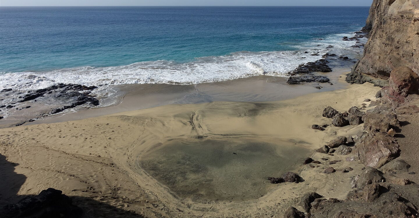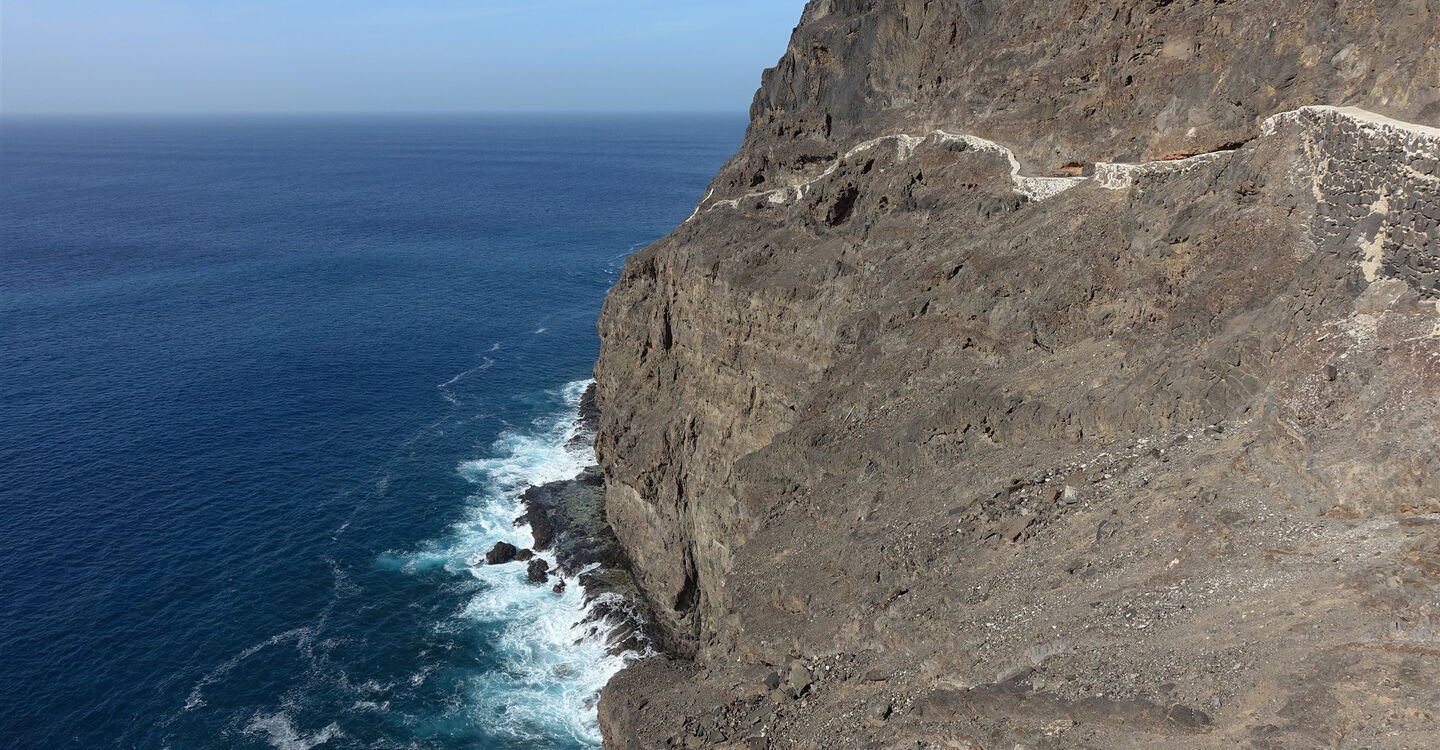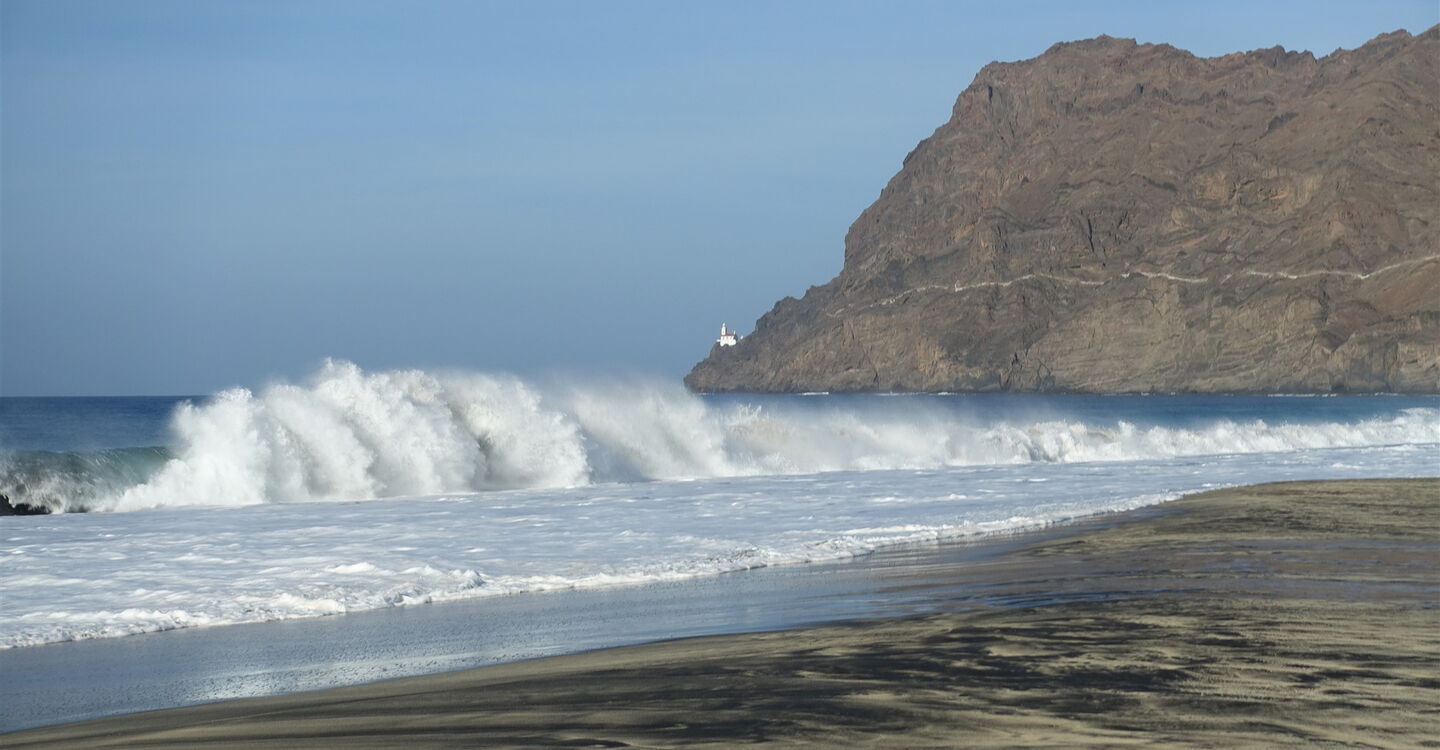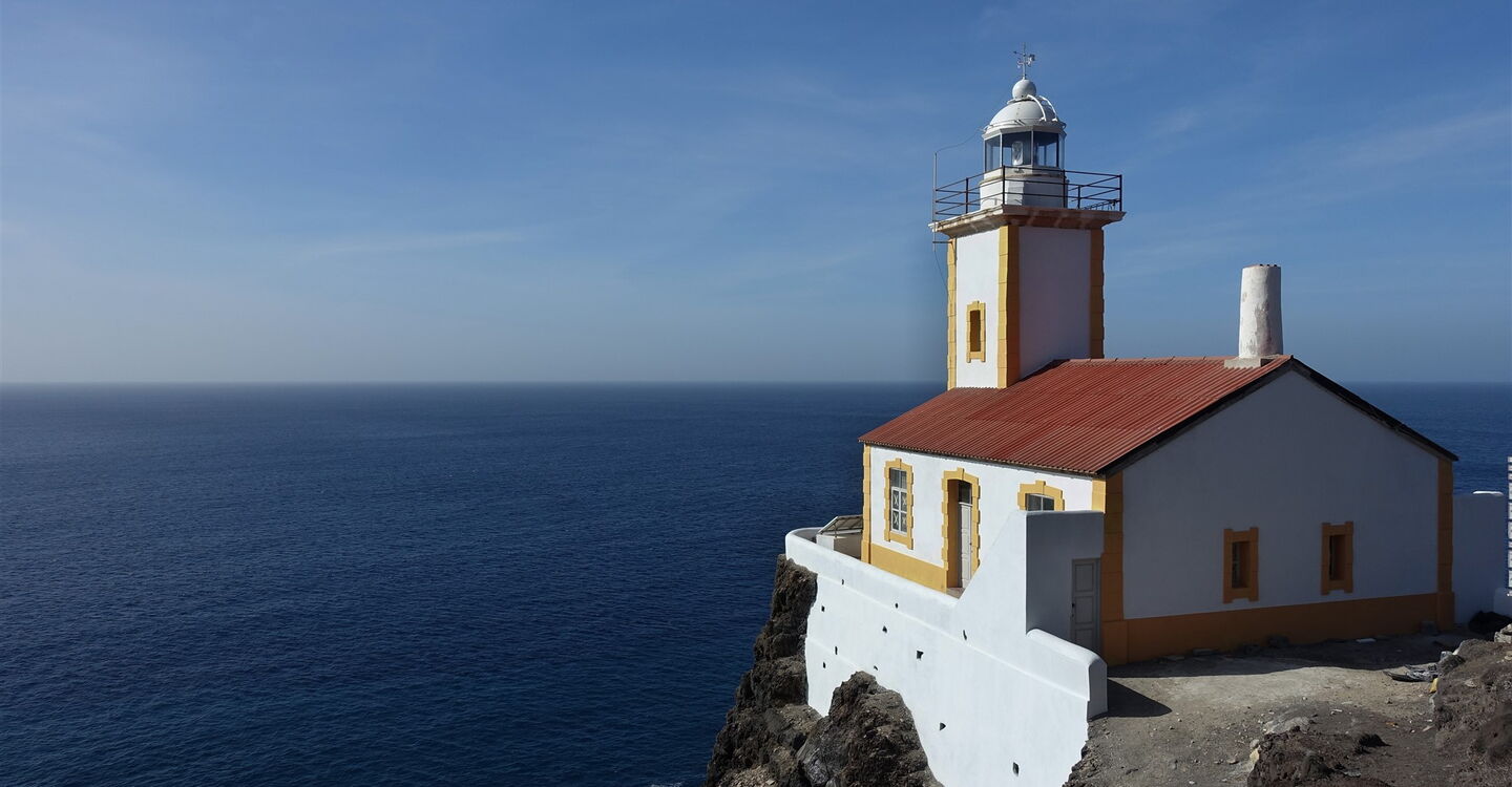 Die Tour beginnt gleich mit einem Paukenschlag, denn sie führt über den 1,6 km langen Traumstrand Baía de São Pedro, der schöner kaum sein könnte. Von Anbeginn der Wanderung ist das heutige Tagesziel, der strahlend weiße Leuchtturm, gut auszumachen. Der nachfolgende Pfad führt durch eine fast senkrecht abfallende Felswand. Der 1894 fertiggestellte und 2018 renovierte Leuchtturm steht 50 m über dem Meeresspiegel auf der Landzunge Ponta do Farole.