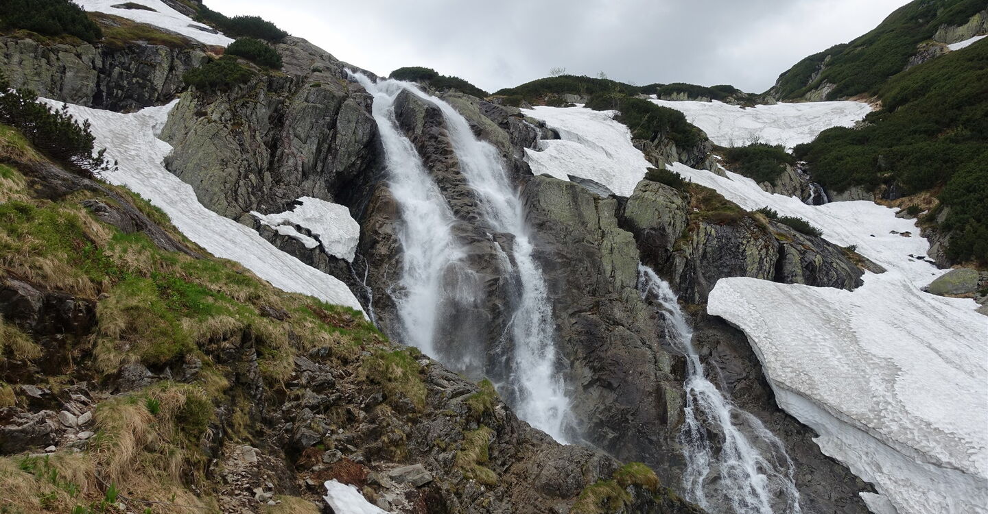Von der malerisch an einem See liegenden Schronisko Górskie PTTK wandern wir nur wenige Meter bis zum höchsten Wasserfall Polens. Der Gletschersee Wielki Staw Polski, in der Dolina Pięciu Stawów Polskich gelegen, fließt über vier Kaskaden in das Dolina Roztoki. Der Wassersturz Siklawa überwindet dabei 80 m. Nach diesem Naturschauspiel steigen wir entlang des Bachlaufes Roztoki durch das ca. 5 km lange Dolina Roztoki ab. Wir schreiten durch gut erhaltenen Baumbestand, viele Bäume sind ca. 300 bis 400 Jahre alt. Auf dem Hauptweg angekommen, befindet sich auf der linken Seite der 10 m hohe Wasserfall Wodogrzmoty Mickiewicza. Den Wanderer erwarten auf dieser Tour schneebedeckte Berge bis in den Juni, tiefblaue Seen und das ständige Rauschen der Bäche und Flüsse.