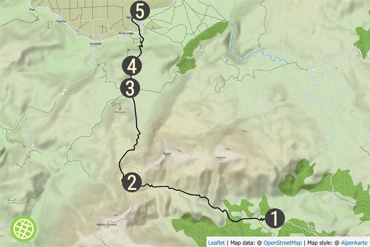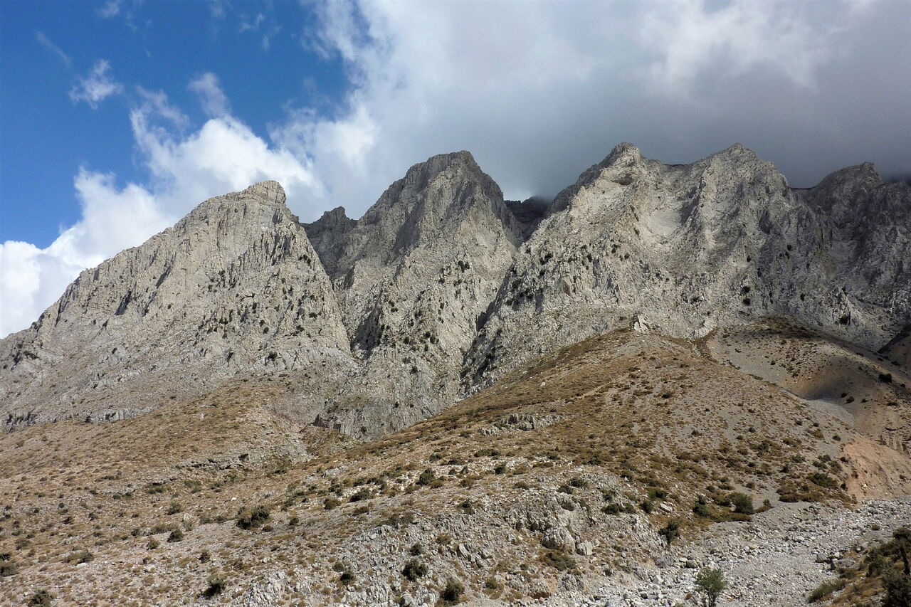 Mit 2148 m ist der Berg Dikti die höchste Erhebung in Kretas dritthöchstem Gebirge. Der Afentis Christos – Herr Christus – ist der zweithöchste Berg mit 2141 m. Der Dritte im Bunde ist der 2085 m hohe Lazaros. Vor dieser beeindruckenden Bergkulisse steigen wir, vorbei an den wohl mächtigsten Kermeseichen auf Kreta, durch Niemandsland zu einer Passhöhe auf. Unterhalb der mächtigen Felswände dieser Riesen erfolgt der Abstieg zu einer Hochebene, um dann über einen alten verwunschenen Verbindungspfad Agios Georgios zu erreichen. Die natürliche Schlichtheit dieser Bergwelt ist einfach nur bezaubernd!