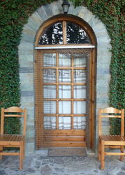 Ab hier beginnt ein wunderschöner alter Steinpfad, der bis zu einer Betonstraße hinunterführt. Direkt hinter den Hundehäusern – die Schafe sollen hier nicht vorbeigehen – gehen wir 80 m rechts, um dann vor dem Betongebäude mit der roten Tür sofort links hinunterzugehen. Wir queren die Asphaltstraße und gehen vor einem gelb-weißen Gebäude direkt auf das Dorf Agios Georgios zu. Wir erreichen die Dorfeingangsstraße und folgen dieser bis zum Dorfplatz, wo wir rechts gehen, um nach 80 m in die Straße links abzubiegen. Diese gehen wir bis zum Ende, um nach 50 m rechts das 05 Hotel in Agios Georgios (831 m) zu erreichen.