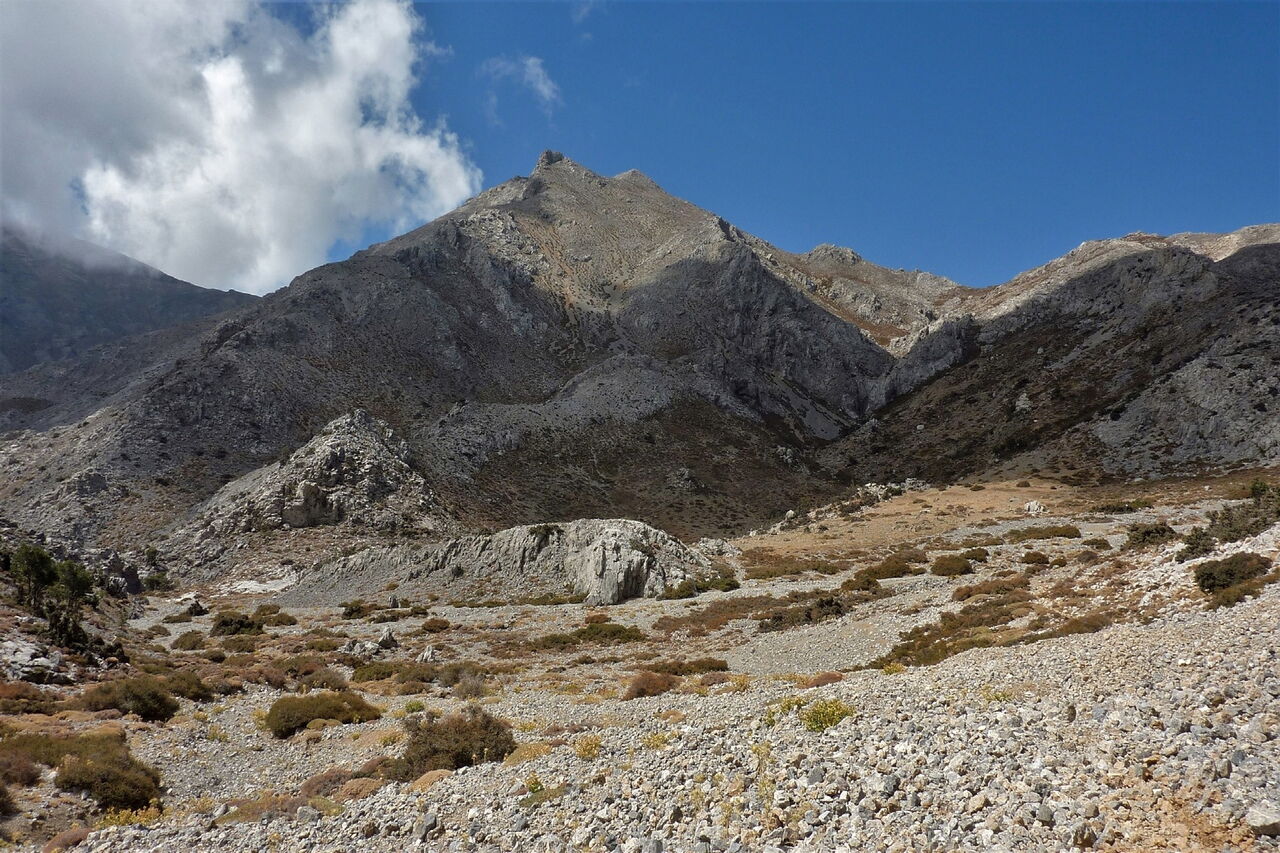 Nach kurzem Abstieg treffen wir auf Wegweiser Richtung Selakano und links zum 2148 m hohen Afentis Christos. Wir gehen geradeaus, weiter bergab, auf einen sehr gut auszumachenden Pfad, der unterhalb der steil abfallenden Felswände des 2148 m hohen Dikti verläuft. Wir queren ein Spülfeld nach rechts, gehen 300 m parallel zu diesem und queren es dann nach links, bis wir auf eine Piste treffen, die uns auf das Limnakaron-Plateau führt – mit der Heiligen Geist 03 Kirche (1125 m). Dreht man sich um, ergibt sich ein atemberaubender Blick auf das Diktigebirge. Wir gehen auf der Schotterpiste weiter, biegen bei der nächsten Möglichkeit aber nicht links ab, sondern verlassen nach 120 m die Piste, um auf dem gerade bergauf verlaufenden Pfad Richtung Einsattelung aufzusteigen.