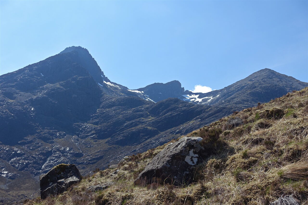 Das faszinierende und weltberühmte Bergmassiv der Schwarzen Cuillins auf der Isle of Skye wird durch die im Halbkreis angeordneten Magmasäulen mehrerer Vulkankrater gebildet. Sie bestehen größtenteils aus Basalt und schwarzem Gabbro – daher die Herleitung des Namens: Black Cuillins. Alle zwölf Munros auf Skye sind Black-Cuillin-Gipfel, mit Ausnahme des Gipfels Blabheinn – siehe Wanderung 23 –, der vom Hauptkamm getrennt steht. Der höchste und unerreichbare Gipfel ist der Sgùrr Alasdair mit stolzen 992 m Höhe, der pyramidenartige Gipfel des Sgùrr nan Gillean ist der schönste Gipfel. Die wichtigste Voraussetzung für eine erfolgreiche Besteigung ist gutes Wetter, denn sonst fehlt die Orientierung in der Steinwüste. Auch nicht zu vernachlässigen ist der finale Aufstieg zum Gipfelplateau mit dem Schwierigkeitsgrad II. Möchte man über die Pinnacle Ridge aufsteigen oder den Gipfel überschreiten und auf seiner anderen Seite absteigen, so begibt man sich in den Schwierigkeitsbereich des technischen Bergsteigens!