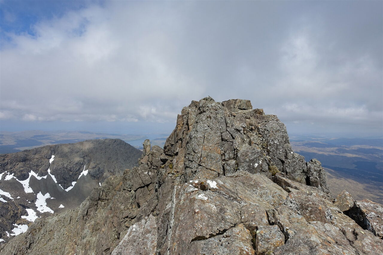 Wir erreichen den Gipfel des 04 Sgùrr Mhor (986 m). Richtung Westen sieht man über den Atlantik bis zu der Insel Skye. Richtung Nordosten kann man das Geschehen auf den Alligin Horns schon einmal beobachten und Richtung Osten thronen die benachbarten großen Gipfel. Bei schlechtem Wetter – und falls man nicht gerne klettern möchte – sollte man an dieser Stelle umkehren und die Hörner auslassen.
