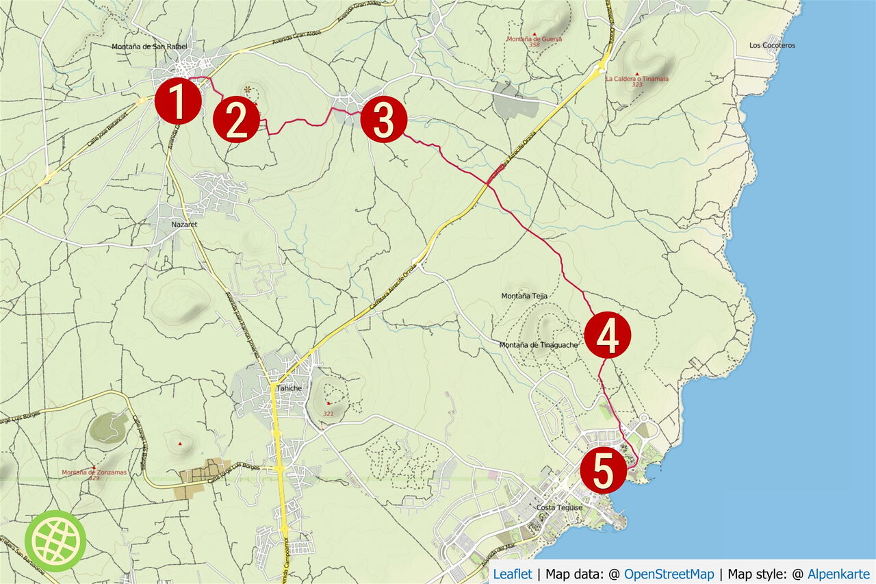 An den wenigen Stellen mit nicht eindeutiger Wegführung wird der Orientierungssinn gefordert. Wegbeschaffenheit: 80 % Schotterwege und 20 % Schotterpfade. Ausrüstungsempfehlung: viel Trinkwasser und etwas Proviant. Auf der Wanderung gibt es keine Einkehrmöglichkeit, aber an Start und Ziel gibt es eine große Auswahl an Restaurants. Diese Wanderung kann zu jeder Reisezeit unternommen werden. Tipp: Jeden Sonntag von 9:00 bis 14:00 Uhr ist in Teguise Markt. Oder an jedem anderen Tag: die Besichtigung von Teguise, einer der ältesten Städte auf den Kanarischen Inseln.