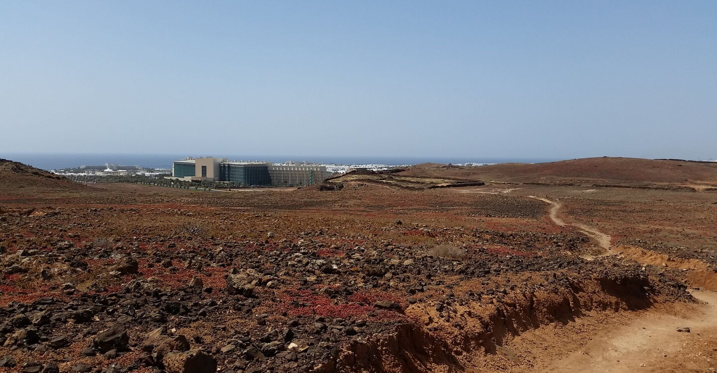 Wir müssen die Hauptstraße umgehen, indem wir 400 m links gehen - parallel zur LZ-1. Wir unterqueren die LZ-1 und gehen anschließend sofort wieder rechts - abermals parallel zur LZ-1 -, um nach 400 m links auf dem Schotterweg weiterzuwandern. Nach einigen Metern folgt das Schild "important birds area" und nach 1 km queren wir eine Kreuzung. Im Abstand von 300 m geht es vorbei an einem Haus auf der rechten sowie einem weiteren Haus auf der linken Seite der Schotterpiste. Kurz hinter einer Anhöhe, es geht leicht bergab, gehen wir bei der Weggabelung rechts. Unmittelbar danach queren wir ein Barranco. Nach einem Wegstück mit hellem Sandboden, rechts von uns schaut man in die Öffnung des (04) Vulkans Monte Corona (71 m), nehmen wir bei der folgenden Weggabelung den rechten Pfad Richtung Hotel Beatriz.