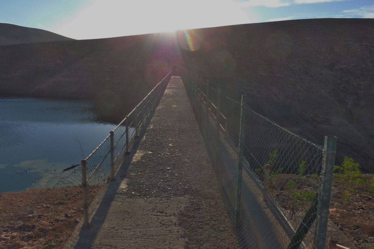 Die andauernde Wasserknappheit war schon immer eines der größten Probleme auf Fuerteventura. Überall auf der Insel sieht man deshalb kleine Staustufen. Diese Wanderung führt um den einzigen nicht verlandeten Stausee auf Fuerteventura. Im ersten Teil steigt der Weg durch die seichten, bei Abendlicht ockergelb erscheinenden Hügelketten an, um dann nach dem höchsten Punkt der Wanderung gemächlich zum Stausee abzufallen. Wir gehen anschließend 600 Meter parallel zum Stausee, bis wir ihn bei seinem südlichsten Zulauf überqueren. Es folgt ein Wegstück durch ein extrem karges Landschaftsbild, bis wir durch eine bewirtschaftete Region wandern und wieder am Ausgangspunkt ankommen.