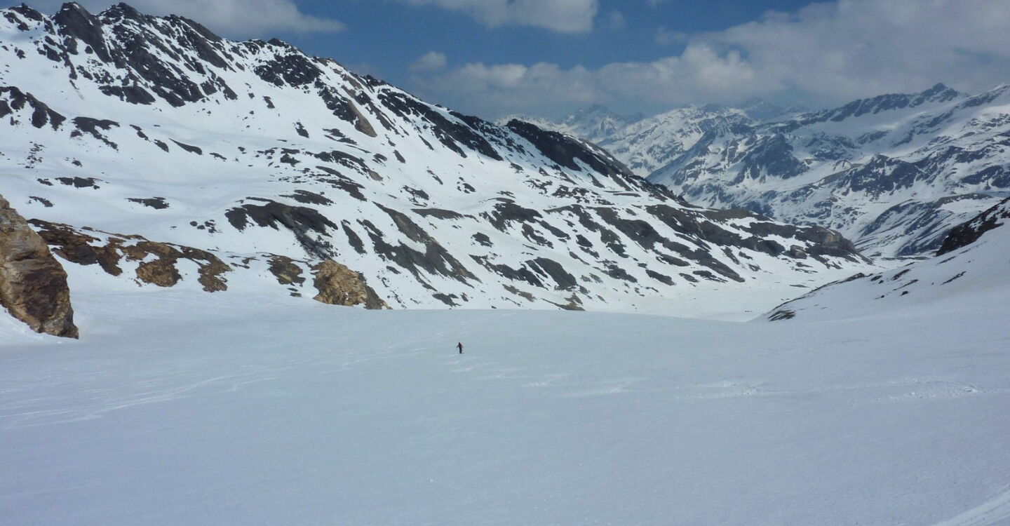 Schwerer Aufstieg zum Eisseepass und weiter zur Eisseespitze. Die Abfahrt ist einfach bei guter Orientierung. Die Abfahrt führt über einen Südosthang. Folgende Ausrüstung wird empfohlen: Produkte für alpine Sicherheit im Schnee, Klettergurt mit Kletterseil, Steigeisen, Tourenski und Skitourenhelm. Es gibt keine Einkehr auf der Tour. Die erste Hütte auf der Tour ist die Zufallhütte im Martelltal. Beste Jahreszeit: Januar bis April. Uns erwarten kurze Stücke mit bis zu 40° Hangneigung.