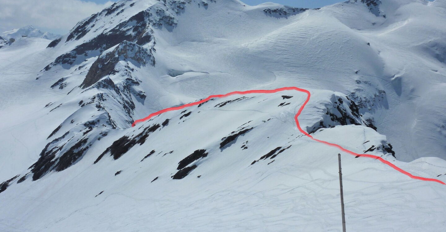 Bei der Bergstation des Lifts B Seilbahn II erreichen wir nach kurzer Abfahrt den Suldenferner. Dort gehen wir ca. 1,5 km bergauf, bis wir uns dann links an den sehr steilen Aufstieg zum Eisseepass machen.