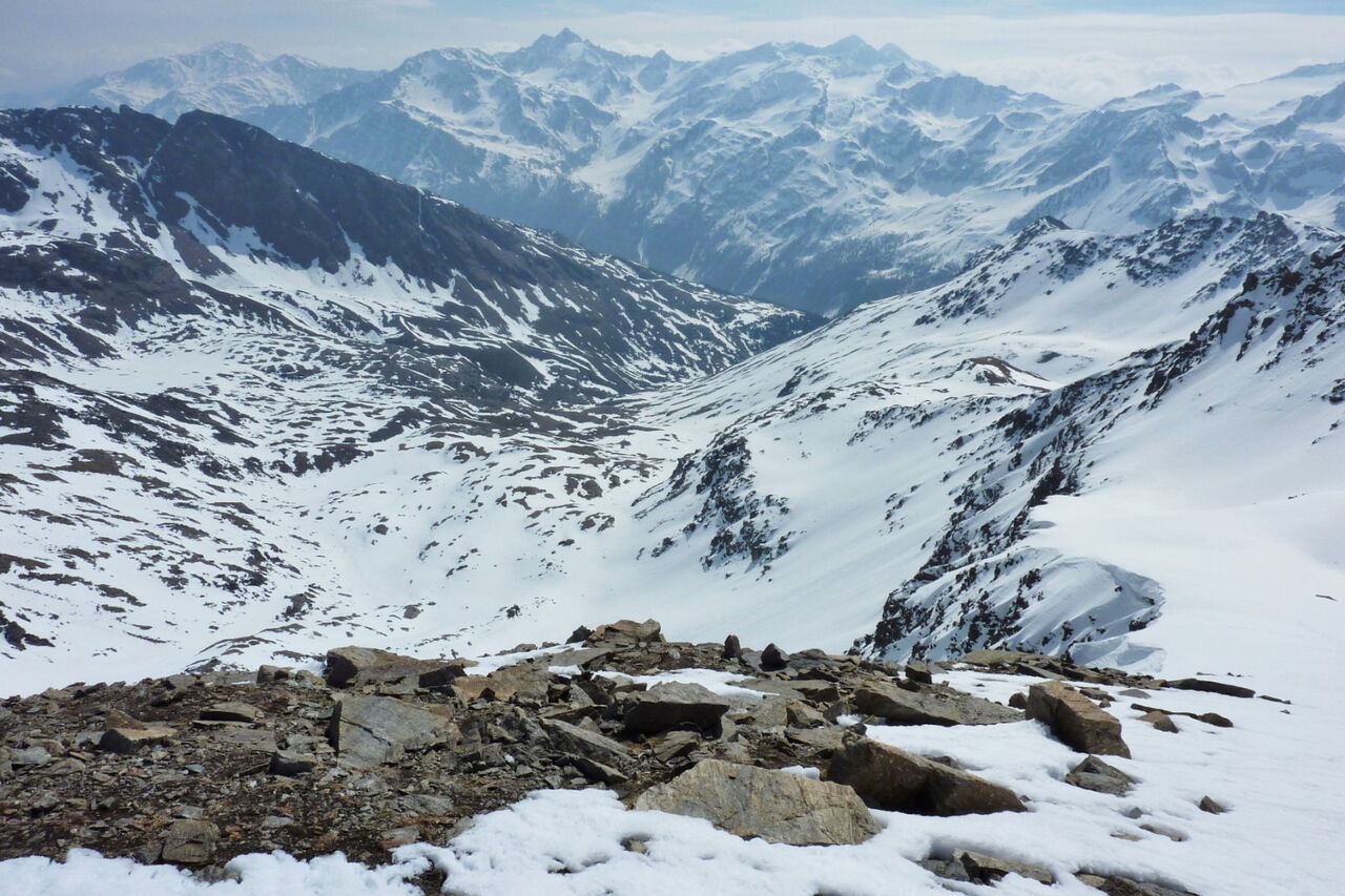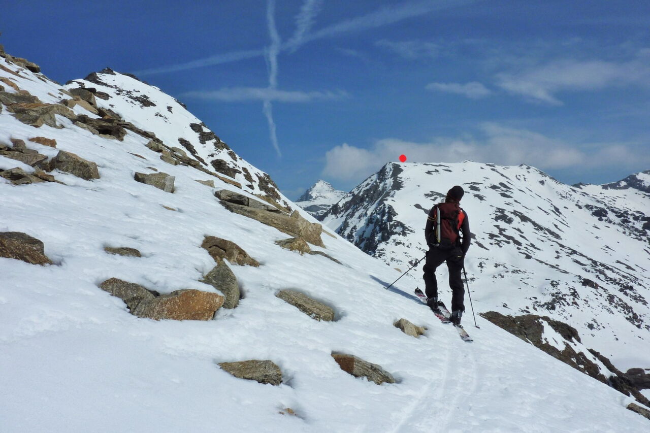 Nun muss man nach links den Hang queren, um kurz aufzusteigen. Man kann auch die Pederspitze auslassen und gleich im Gegenhang die 40 hm zum Pass überwinden, um ins Pedertal zu kommen.