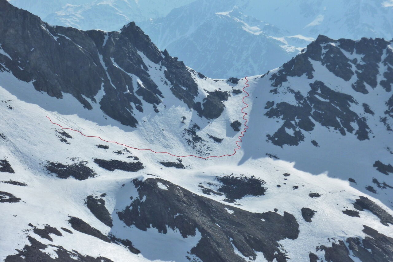 Wir fahren noch ca. 1 km im Hang querend bergab, bis wir dann stetig, später in spitzen Kehren, direkt auf die Pederspitze gelangen. Nach einer Pause geht es auf der gleichen Strecke bergab.