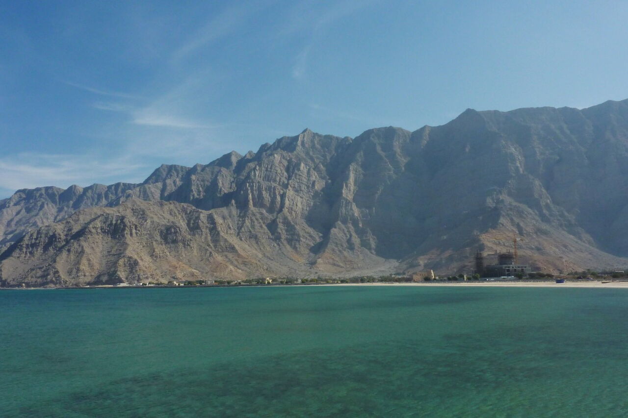 Wir fahren nun auf der neu erbauten Küstenstraße weiter nach Khasab. Sie schlängelt sich durch die karge Landschaft mit den steilen, zum Wasser hin abfallenden Ausläufern vom Hajar-Gebirge.