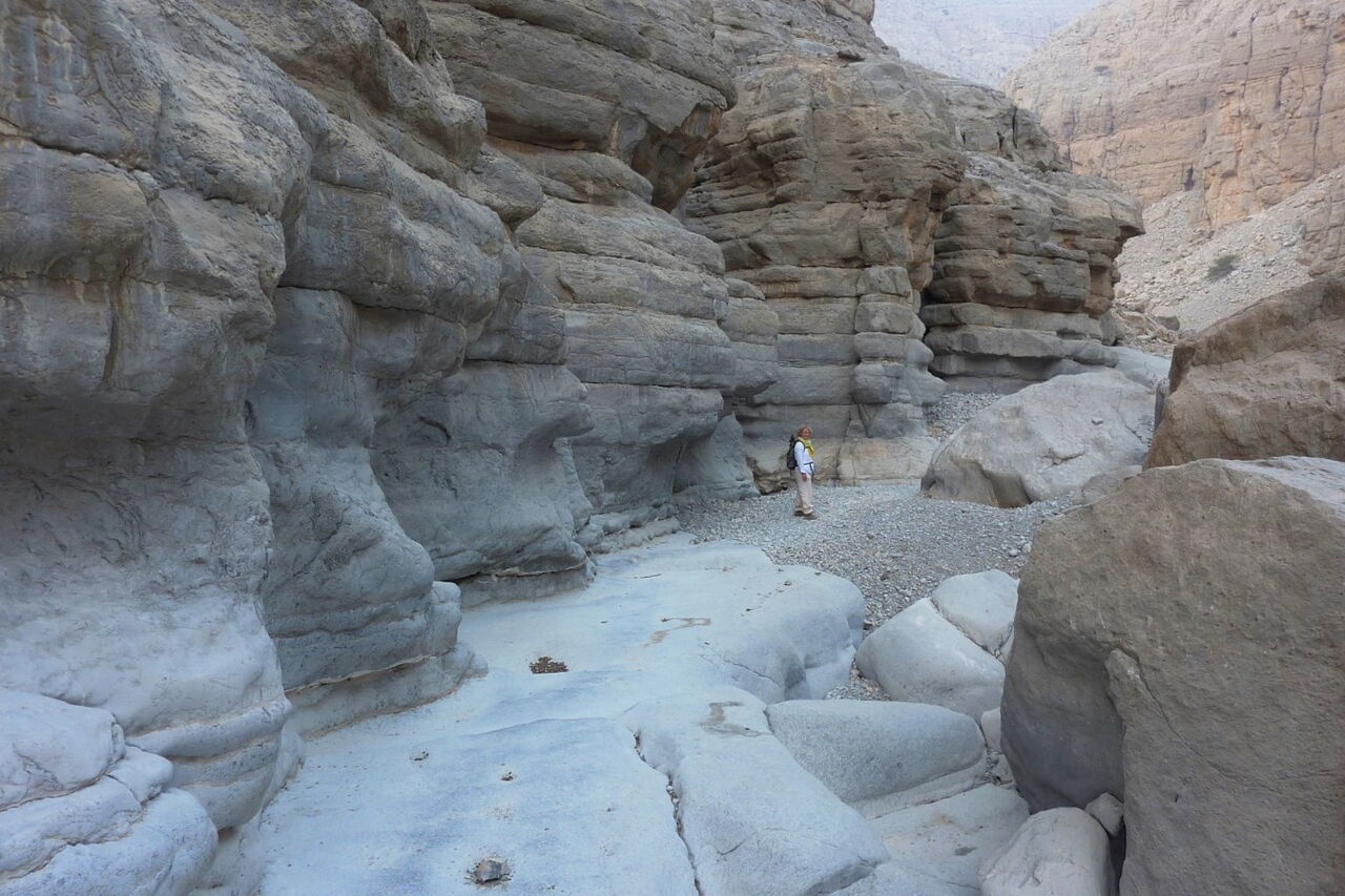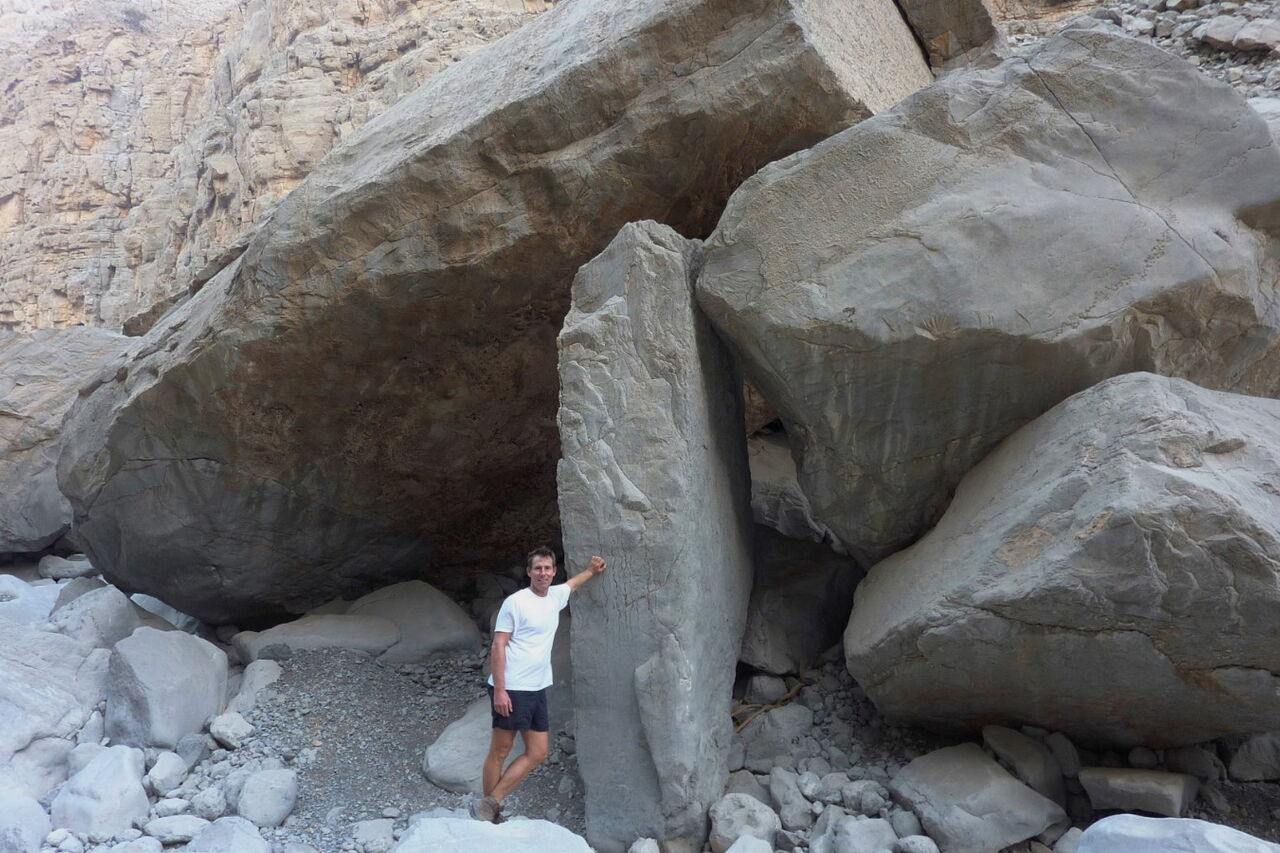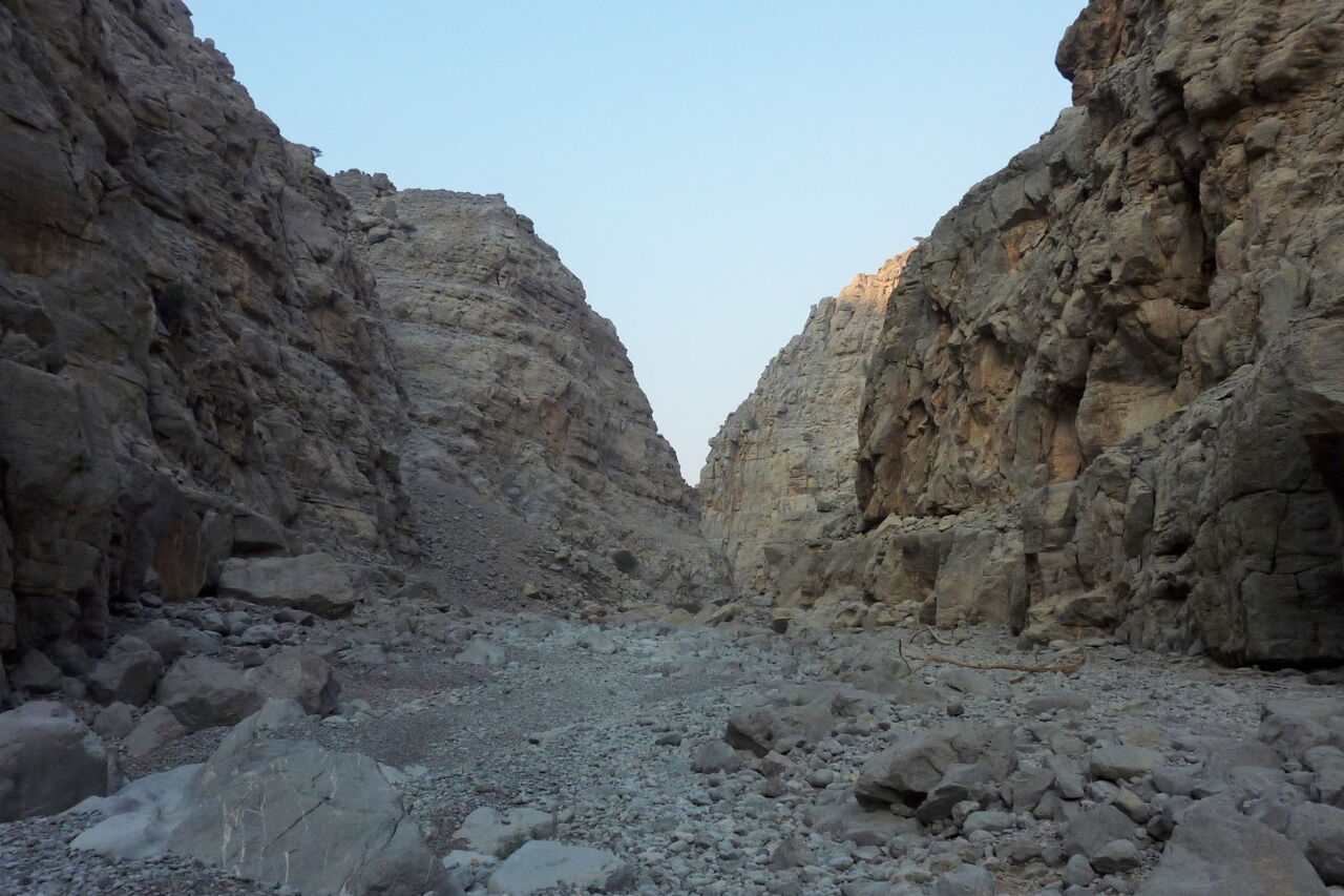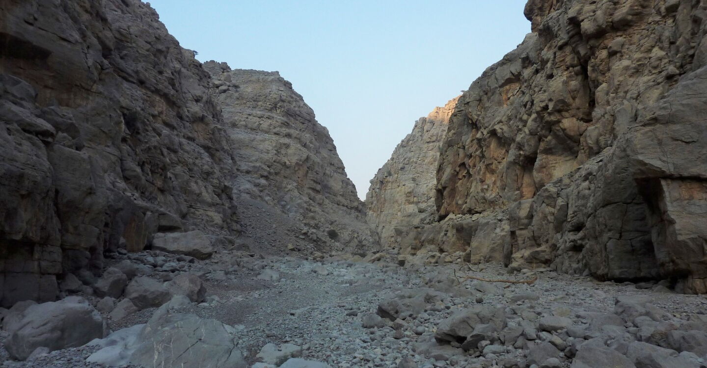 Wir gehen auf einem Pfad ins Wadi Qadah hinein. Die Wände der umliegenden Berge fallen hier bis zu 400 hm senkrecht ab, und der Pfad ist gesäumt mit riesigen Steinblöcken.