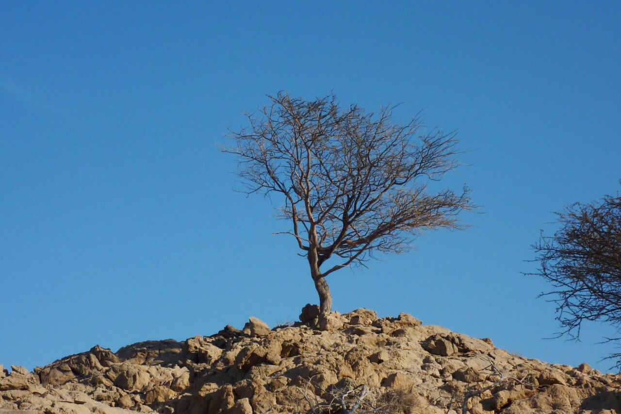 Ab hier ist ein Pfad zu erkennen, der nur leicht an Höhe verliert und ca. 600 m quer durch den links liegenden Hang führt, bis wir an eine weitere Wasserscheide kommen, wo rechts ein paar Akazien erhöhter stehen.