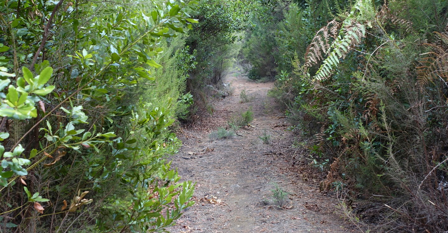 Der Weg endet und wir gehen links 100 m auf der (05) Pista Jaranita (1143 m) bergauf, um dann halb rechts auf dem Pfad den Abstieg fortzusetzen. Auf einem schmalen Steig geht es durch den Wald bergab, bis wir die enge Kehre der Hauptstraße erreichen, der Ausgangspunkt der Wanderung.