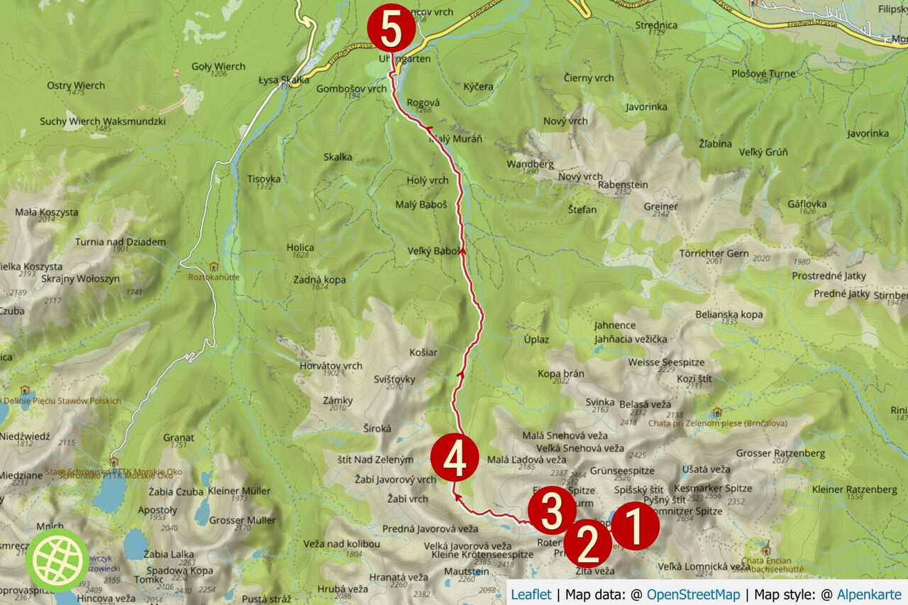 Start: Téryho Chata. Der Zustieg ist in der Wanderung 52 beschrieben. GPS: 49.190250 20.199000. Rückfahrt zum Start der Zweitageswanderung von der Bushaltestelle Tatranská Javorina,,pošta nach Starý Smokovec/Vysoké Tatry,aut.st.. Abfahrt um 16:58 Uhr und 20:18 Uhr. Die Fahrzeit beträgt 52 Minuten. Oder Weiterfahrt von der Bushaltestelle Tatr.Javorina,,pošta zur Bushaltestelle Tatr.Javorina,,Lysá Poľana zur anschließenden Zweitageswanderung, wie unter Tour 48 und 49 beschrieben. Abfahrt um 6:56 Uhr oder um 10:29 Uhr. Die Fahrzeit für die 3 km beträgt 4 Minuten.