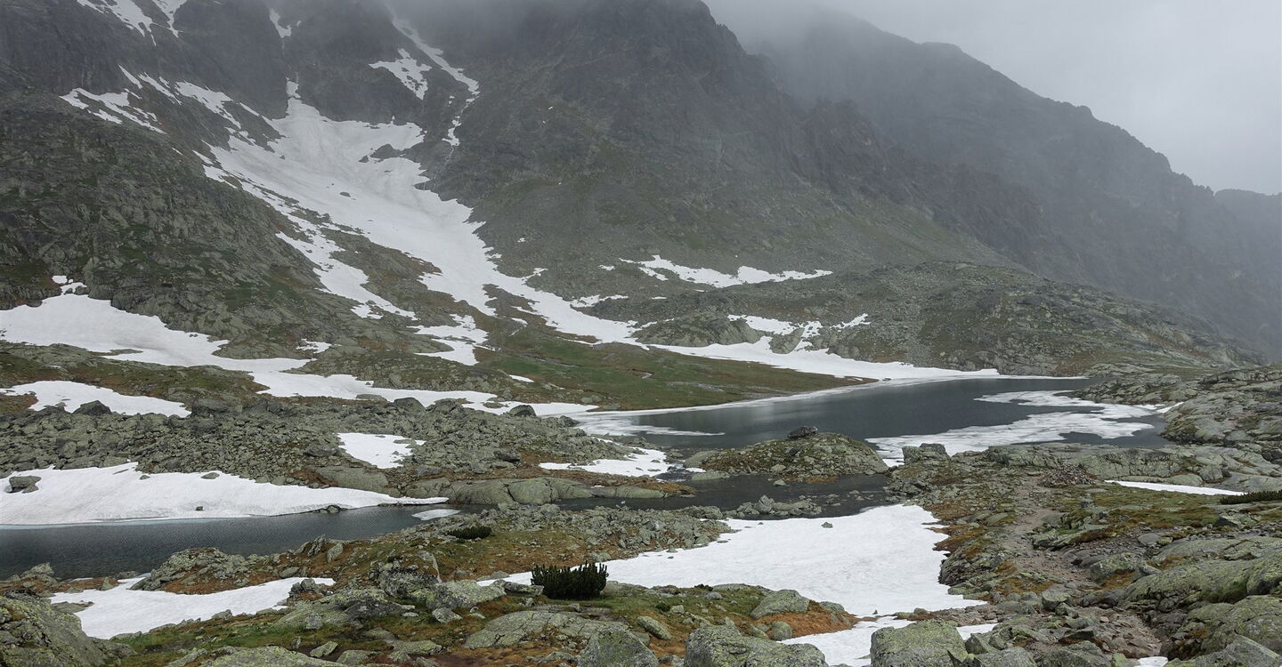 Noch einmal der Hinweis: Aus Naturschutzgründen ist der Wanderweg in der Zeit vom 1. November bis 14. Juni geschlossen. Es drohen deftige Strafen bei Nichteinhaltung! Von der 01 Téryho Chata (2015 m) gehen wir durch das Hochtal mit seinen von Gletschern geschliffenen Felsen, Feucht- und Wasserflächen in westliche Richtung bis zum ersten See der Päť Spišských plies. Über in den Abfluss des türkisgrünen Sees (wenn denn die Sonne scheint) verlegte Steine balancieren wir auf die andere Uferseite und folgen dem weithin sichtbaren Pfad.