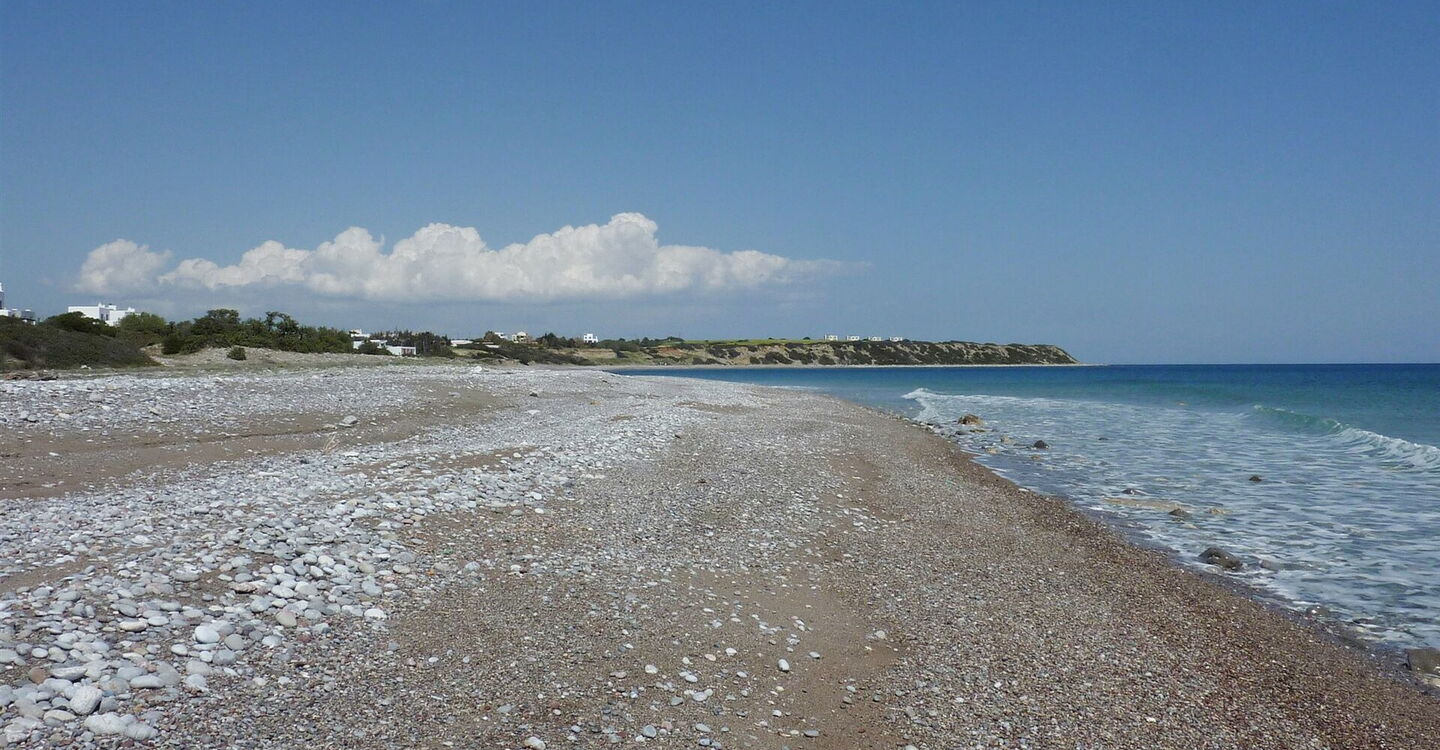 Hier unterqueren wir die Brücke weglos und gehen nun im Trockenflussbett, bis wir den (05) Strand von Lachania (1 m) erreichen. Es folgt ein astreiner Spaziergang an dem 1,7 km langen Kieselsteinstrand. Sobald wir auf gleicher Höhe mit den Flutlichtern für die Tennisplätze sind, gehen wir auf der bergauf führenden Piste oberhalb der Häuser des Thalasso Spa Resort – aber schon in der Anlage – bis zu unserem geparkten Pkw.
