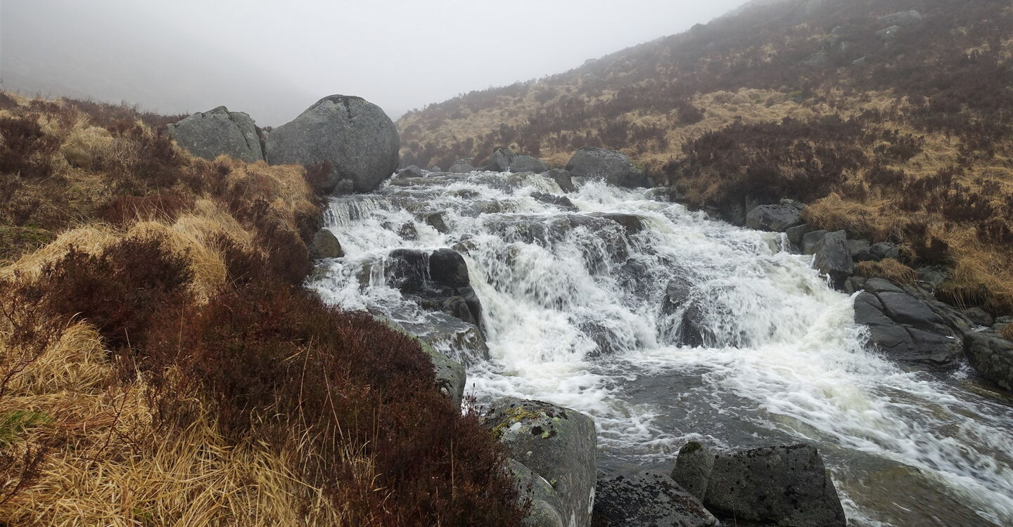 Wir gelangen wieder auf den Hauptweg beim Parkplatz und folgen nun der für Autos gesperrten Straße bergab. Mit Blick auf den Loch Trool überqueren wir eine Brücke und gehen links an dem Privatgrundstück vorbei, bis wir dem linken Wegweiser Richtung Gairland Burn und Loch Valley durch ein Gatter folgen. Der Pfad steigt kontinuierlich an, während wir mehrere Gatter passieren. Das tiefe Grollen des Flusslaufes 02 Gairland Burn (259 m) ist unser Wegbegleiter. Der Weg ist extrem sumpfig, führt aber durch eine atemberaubende Naturlandschaft.