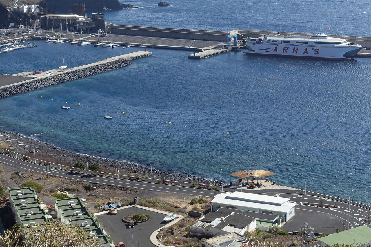 Wir kommen an einem vereinzelten Zedernwacholderbaum vorbei und nach 170 m auf einer Asphaltstraße verlassen wir diese in der ersten Linkskehre. Weiter geht es auf dem geradeaus weiterführenden Camino. Sobald wir links unterhalb eine Ruine mit einem rotbraunen Dach sehen, ignorieren wir auch den linken Abzweiger Richtung Valverde. Oberhalb des Wasserreservoirs vom Wind-Wasserkraftwerk steigen wir im steilen und gerölligen Gelände bis zum Kreisverkehr am (02) Hafen von Estaca (13 m) ab.