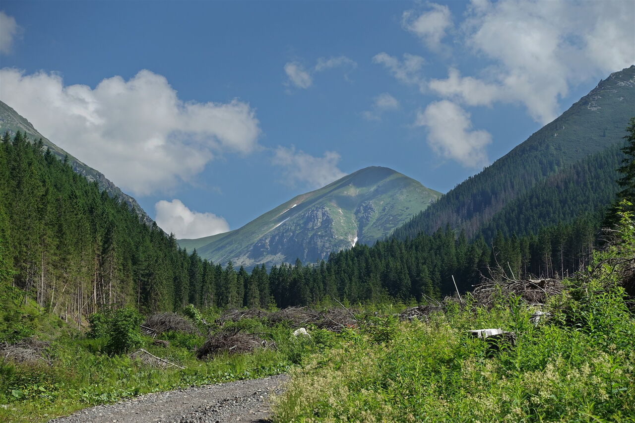 Inzwischen sind wir so weit durch die 04 Račkova Dolina (1218 m) aufgestiegen, dass der Wald den Blick freigibt und wir direkt auf den 2176 m hohen Berg Klin blicken können. Ab dort, wo die Piste in einen Pfad übergeht – hier befindet sich auch eine kleine Parkbucht – ist der Wanderweg in der Zeit vom 1. November bis zum 14. Juni eines jeden Jahres gesperrt. Wir kommen schließlich an einem weiteren überdachten Picknickplatz vorbei.