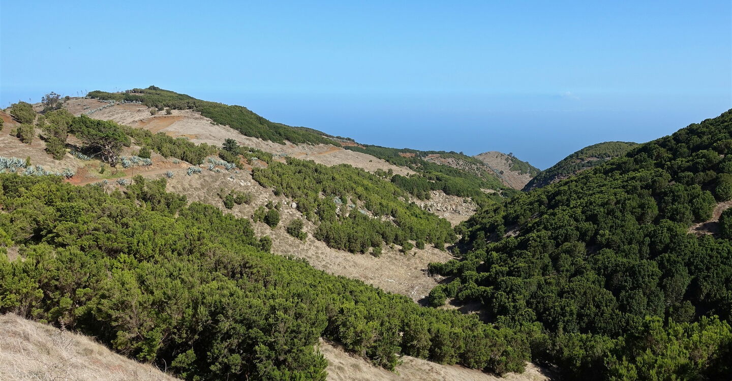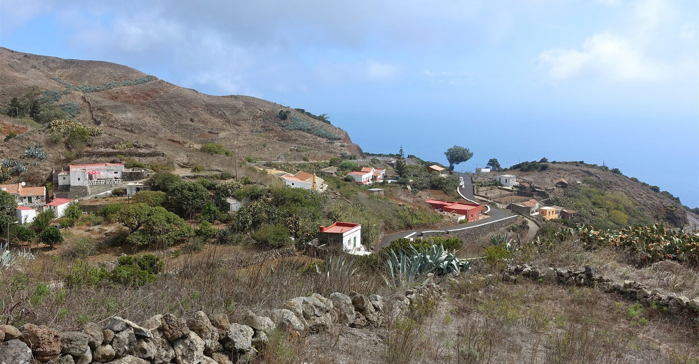 Ab hier gehen wir auf dem Fernwanderweg, der die Insel auf ihrer gesamten Länge durchquert. Fortan ist der Pfad gut markiert und breit ausgebaut, sodass es beinahe unmöglich ist, sich zu verlaufen. Wir queren zweimal die Straße und erreichen die (05) La Caldereta de Tinor (803 m), den Kessel des ältesten Vulkans der Insel. Heutzutage beherbergt die relativ erdbebensichere Caldera das obere Wasserreservoir der Wind-Wasserkraftanlage. Ein letztes Mal queren wir die Hauptstraße und gehen links hinter der Leitplanke auf dem gepflasterten Weg nun direkt nach Valverde herunter.