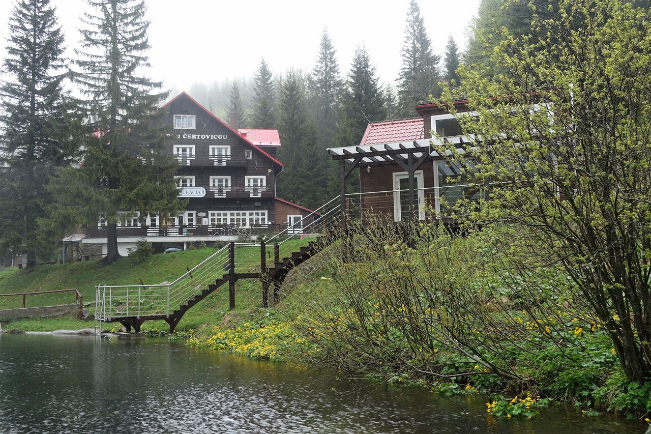 Gemächlich geht es auf der Forststraße bergab bis zum Pass 05 Čertovica (1232 m). Noch vor der Passstraße mit den Häusern führt rechts eine schmale asphaltierte Straße bergab. An dieser Stelle befindet sich auch ein Wegweiser Richtung Chata pod Čertovicou (100 m). Nach kurzem Abstieg erreichen wir eine Stichstraße, die zur Unterkunft und dem dazugehörigen Restaurant führt. Lässt man die Stichstraße aus, so kommt man auf dem Weg ins Tal an weiteren historischen Bauernhäusern vorbei. An der Ortsdurchgangsstraße von Vyšná Boca gelangt man rechts bis zum Ausgangspunkt.