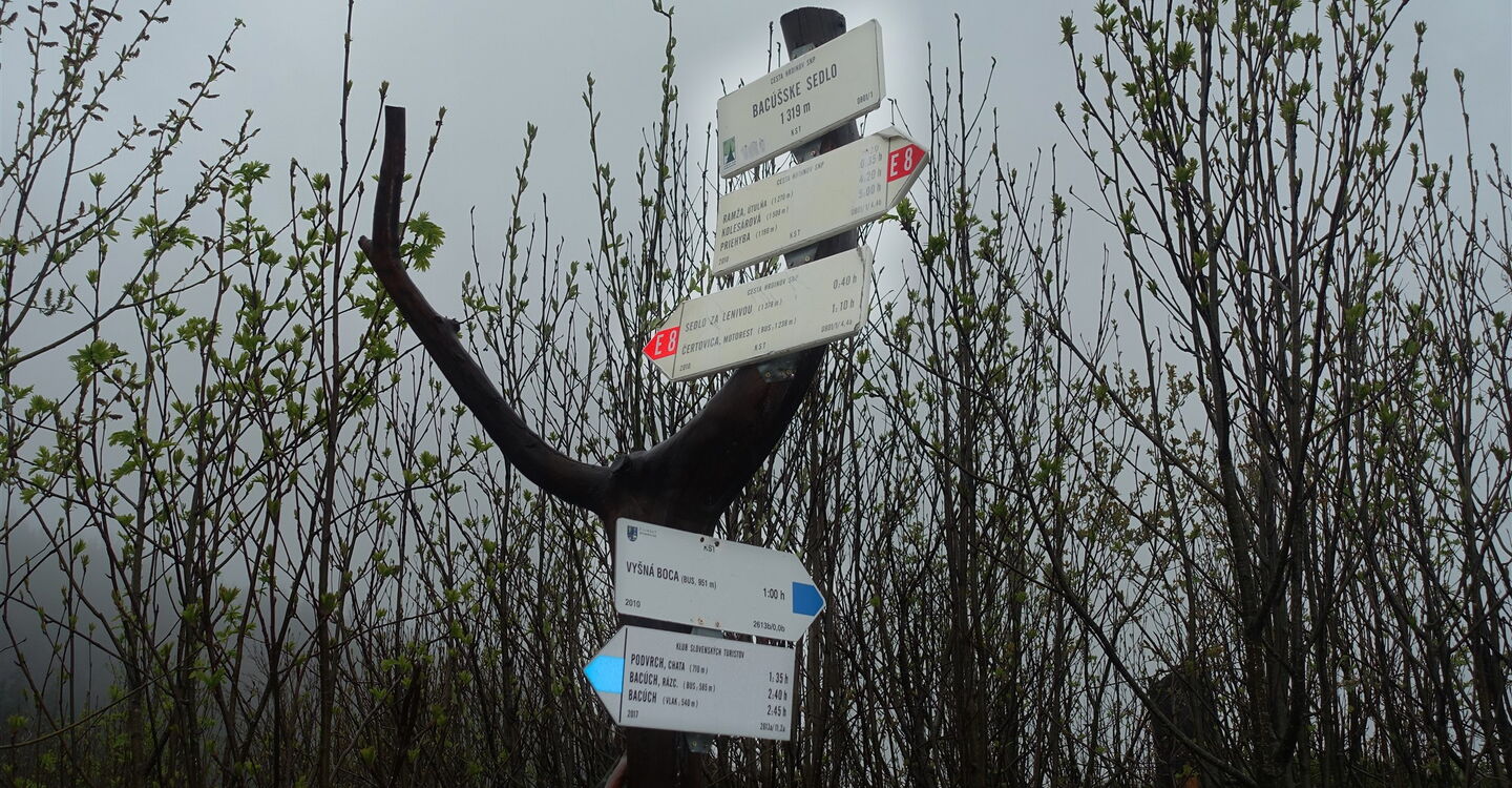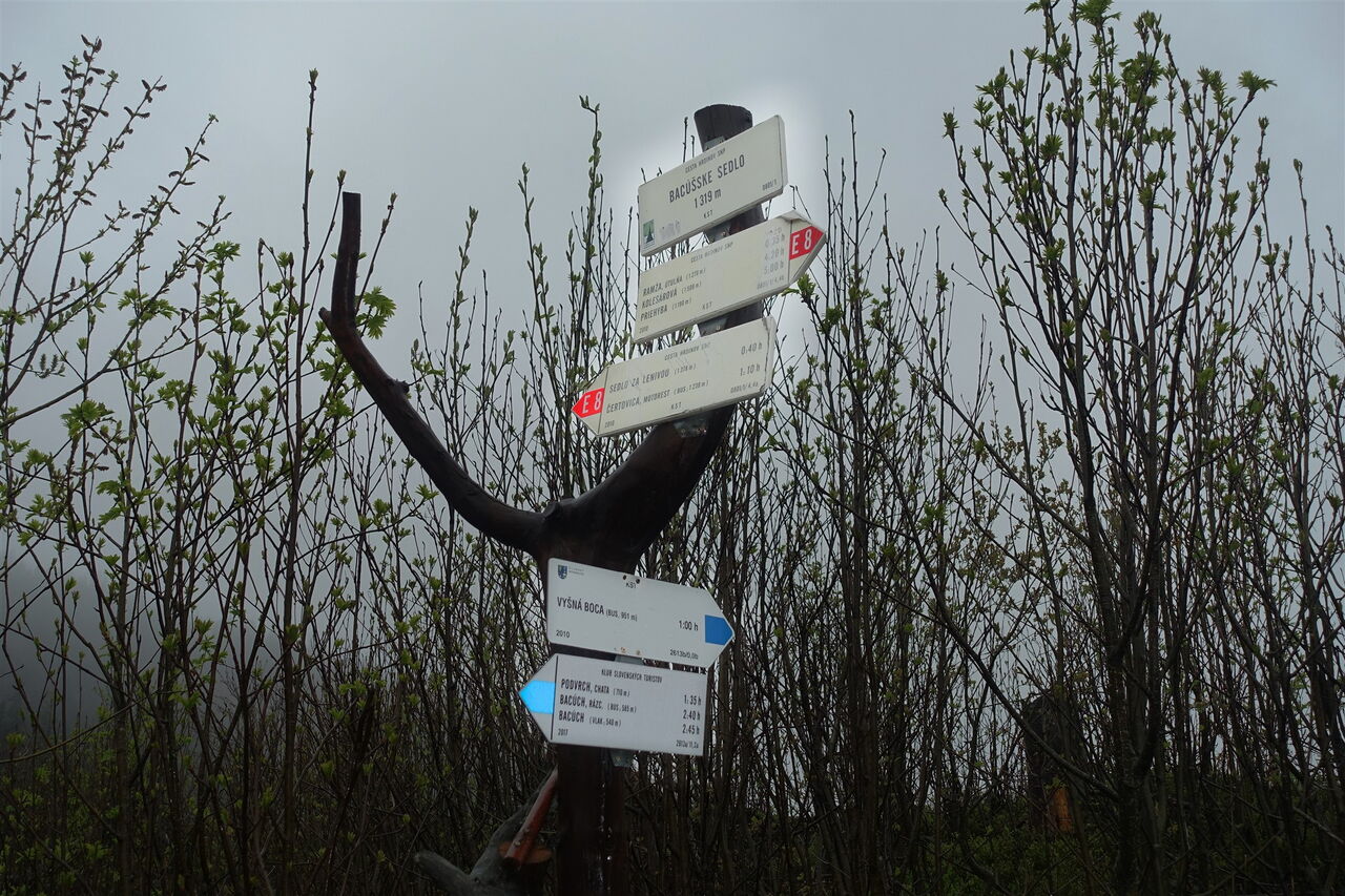 Auf einem Bergrücken angekommen, gehen wir einige Meter rechts, um dann links unterhalb dieses Bergrückens den 03 Bacúšske sedlo (1319 m) zu erreichen. Wir marschieren nun in westliche Richtung auf dem rot markierten Fernwanderweg E8 Richtung Čertovica. Bei der darauffolgenden Weggabelung sind beide weiterführenden Arme zielführend.