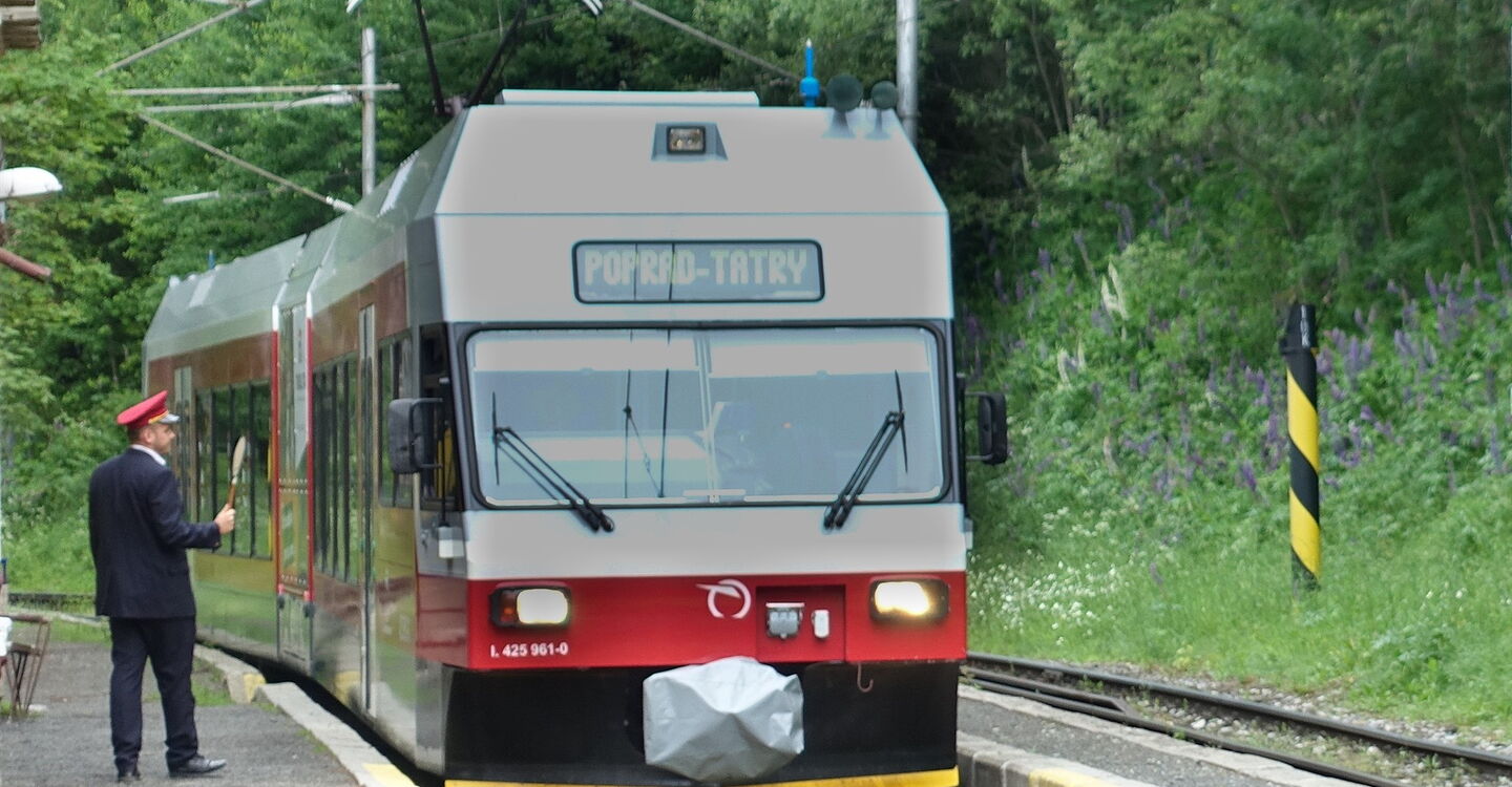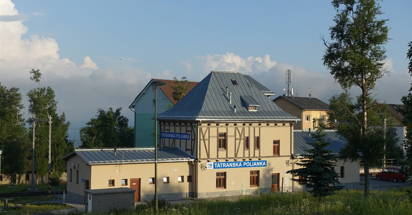 Direkt hinter einer Brücke und dem darauffolgenden überdachten Picknickplatz verlassen wir die asphaltierte Straße nach halb rechts und wechseln auf einen Pfad. Im weiteren Verlauf queren wir mehrmals die Straße. Bei einem Parkplatz gehen wir dann bis zur Hauptstraße herunter, queren diese und erreichen nach wenigen Metern bergab den Bahnhof 05 TEŽ Tatranská Polianka (941 m).