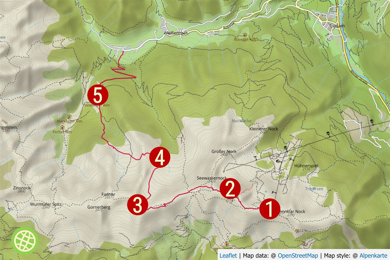 Wir steigen links 150 hm auf das Fadnle. Nun sehen wir unten im Tal die Fadneralm. Hier queren wir das Tal Richtung Nordwesten und kommen nach einem Waldstück zur urigen Innerhofer Alm.