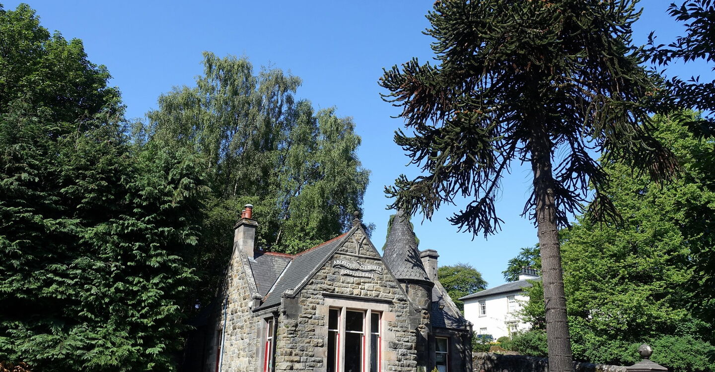 Beim großen Parkplatz an der Glenfiddich-Whiskybrennerei gehen wir bis an die Hauptstraße zurück und dort einige Meter links bis zur Bushaltestelle mit einer kupfernen Brennblase, die zur Destillation verwendet wird. Nach der Busfahrt erreichen wir die Ortschaft Aberlour. Wenn wir nicht zu früh aussteigen, sind wir bei dem großen Platz mit der dahinter liegenden Kirche. Direkt hinter dem Coop gehen wir links in die Queens Road und biegen bei der nächsten Möglichkeit rechts ab. Wir gehen am Ende der Straße bis an den Bach herunter, rechts bis zur Straße vor, links über die Brücke und abermals links bis zur 1826 gegründeten 01 Aberlour Distillery (95 m). Das Besucherzentrum befindet sich in einem urigen Steinhaus unter einer riesigen Norfolktanne.