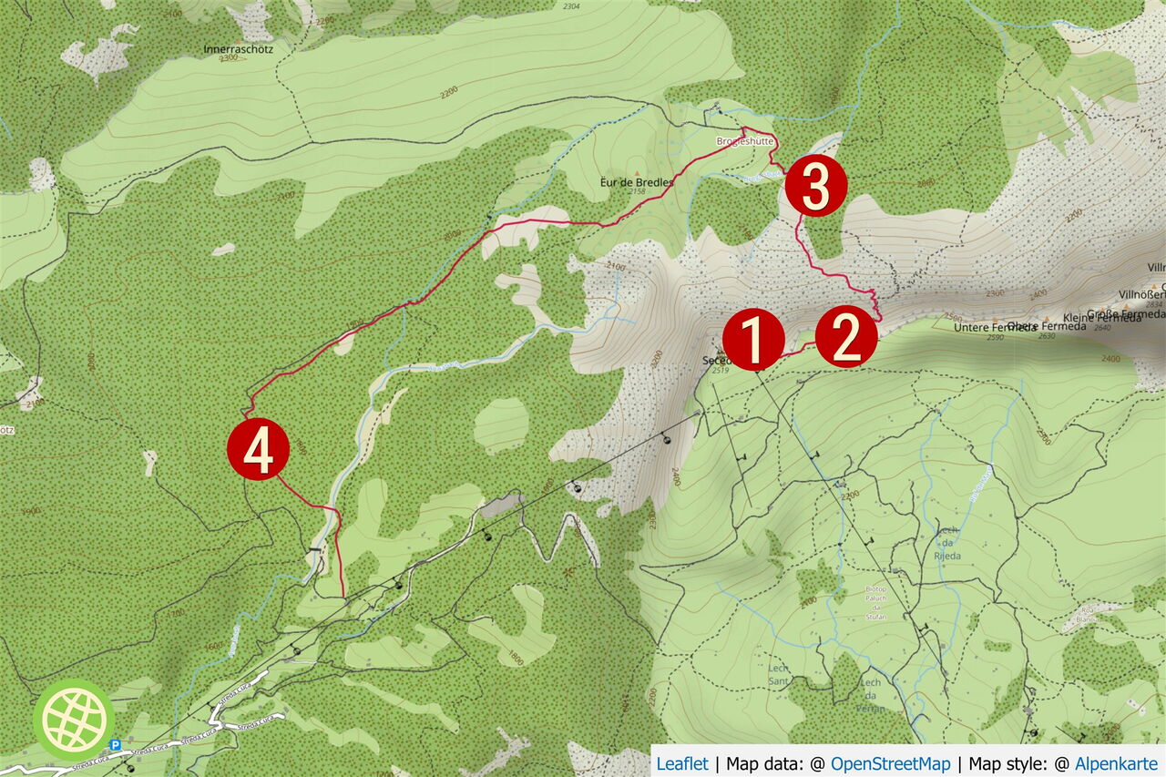 Geokoordinaten zum Start 46.556617 11.758983. Sie führen Dich nach Wolkenstein, wo Du das Auto parkst.