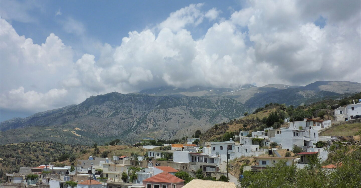 Wir gehen 850 m auf der Asphaltstraße und verlassen diese in der Rechtskehre auf den halb links beginnenden Schotterpfad. Bei guter Sicht haben wir von dieser Position einen atemberaubenden Blick auf den Psiloritis. Auf der anderen Talseite sieht man unser heutiges Tagesziel, die Ortschaft Kouroutes. Beim Dorfplatz mit den Informationstafeln gehen wir links auf der Straße noch durch die nachfolgende Kehre, biegen dann die zweite Straße links ab, anschließend sofort wieder rechts und erreichen nach 80 m die Unterkunft 05 Χenonas Kourites (535 m).